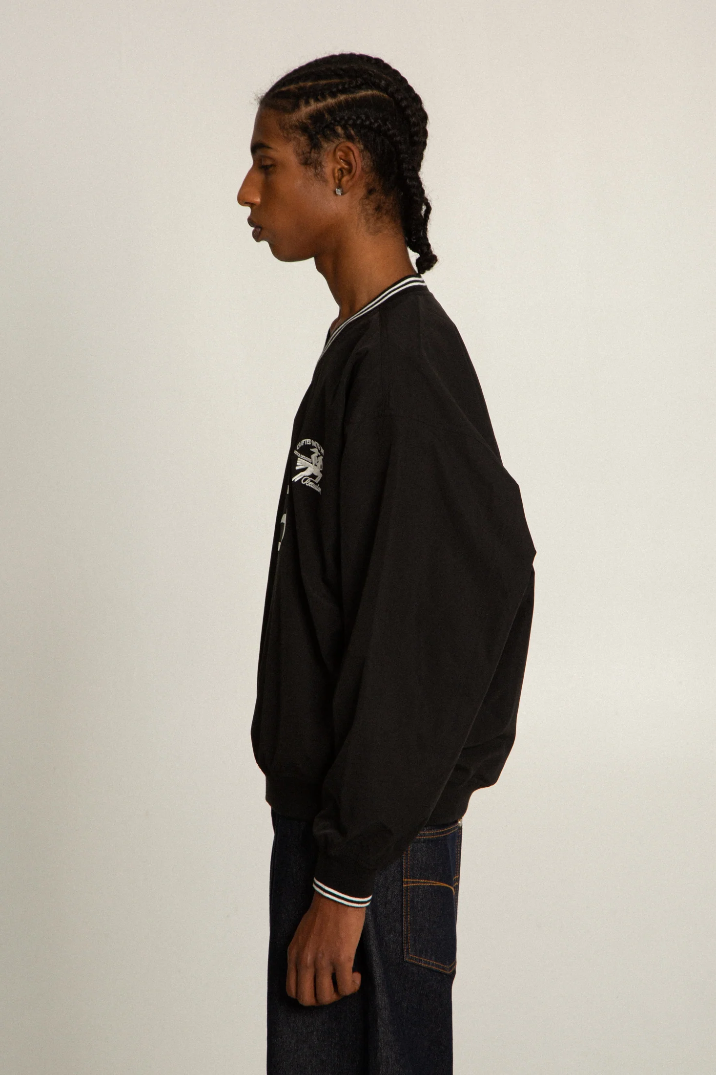 Cut wide and artfully slouched, the V-neck Pre-game Windbreaker blends vintage athleticism with modern cinematic detailing. A piece made for movement, story, and presence.